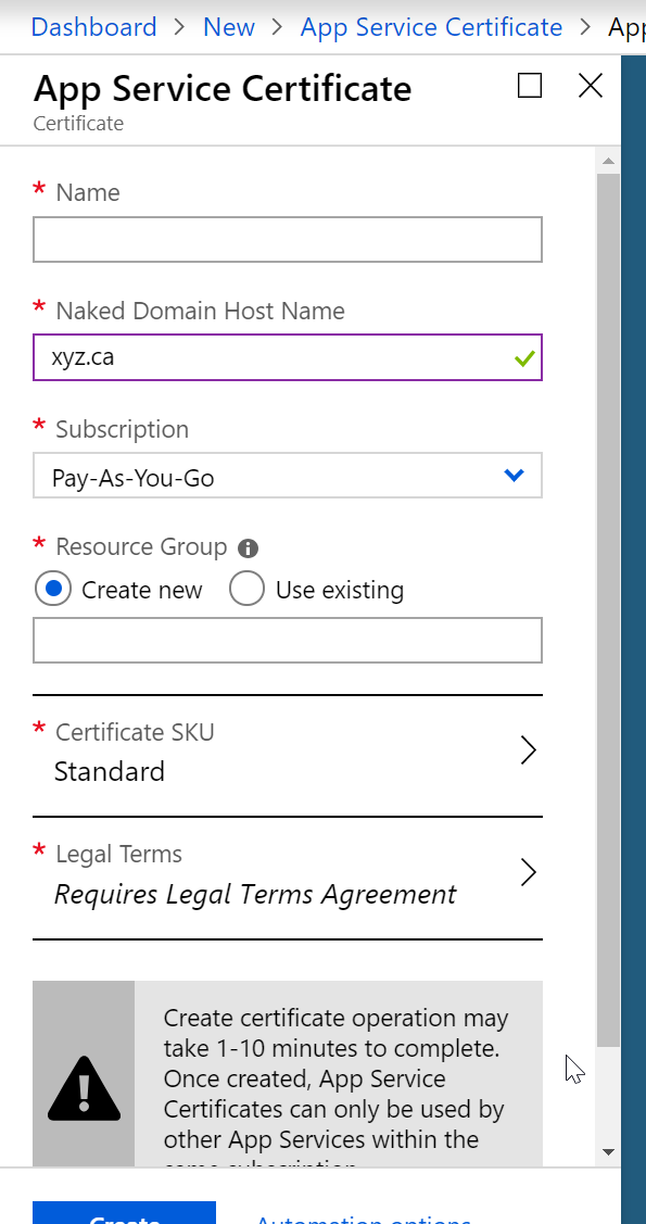 正如评论所指出的,与其通过Azure Portal购买一个,不如通过letsencrypt.org获得一个免费的