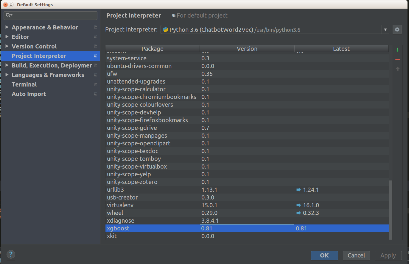 $ cd My_Projectsource myproject/bin/activate$ sudo pip install xgboost$ sudo pip install --upgrade xgboost我还将xgboost模块添加到Python 3.6中的项目解释器中。