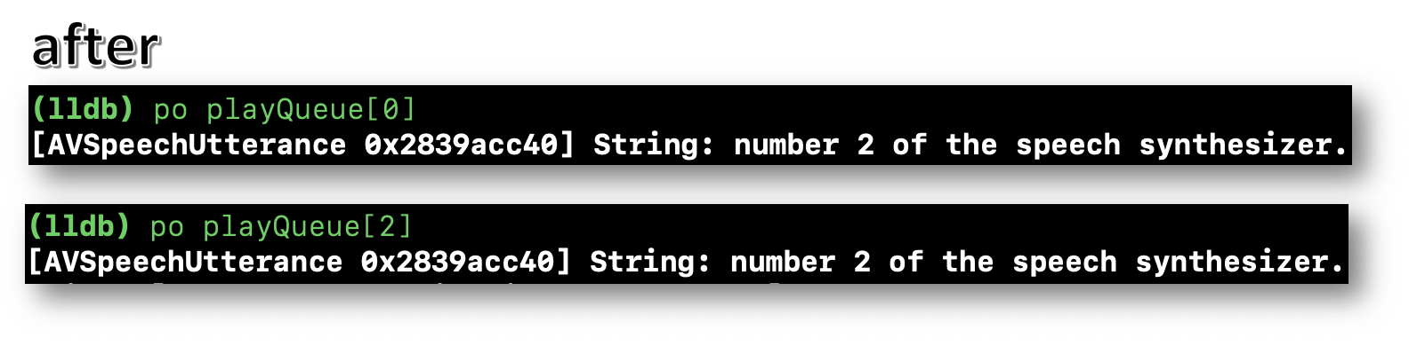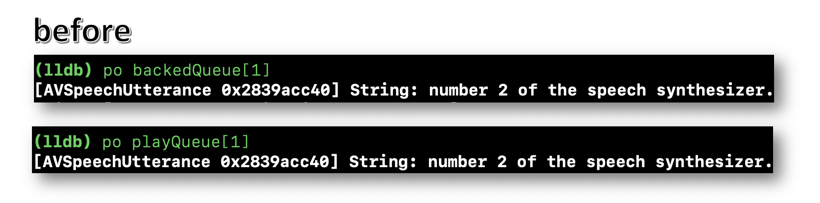 不幸的是,正如系统所指出的,AVSpeechUtterance不能排队两次,这正是您在这里要做的: playQueue索引0和2的对象具有相同的内存地址。