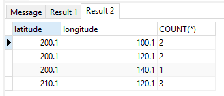 SELECT LATITUDE, LONGITUDE,COUNT(*) FROM checked_in WHERE currnet <> 0 GROUP BY LATITUDE, LONGITUDE;结果是:-