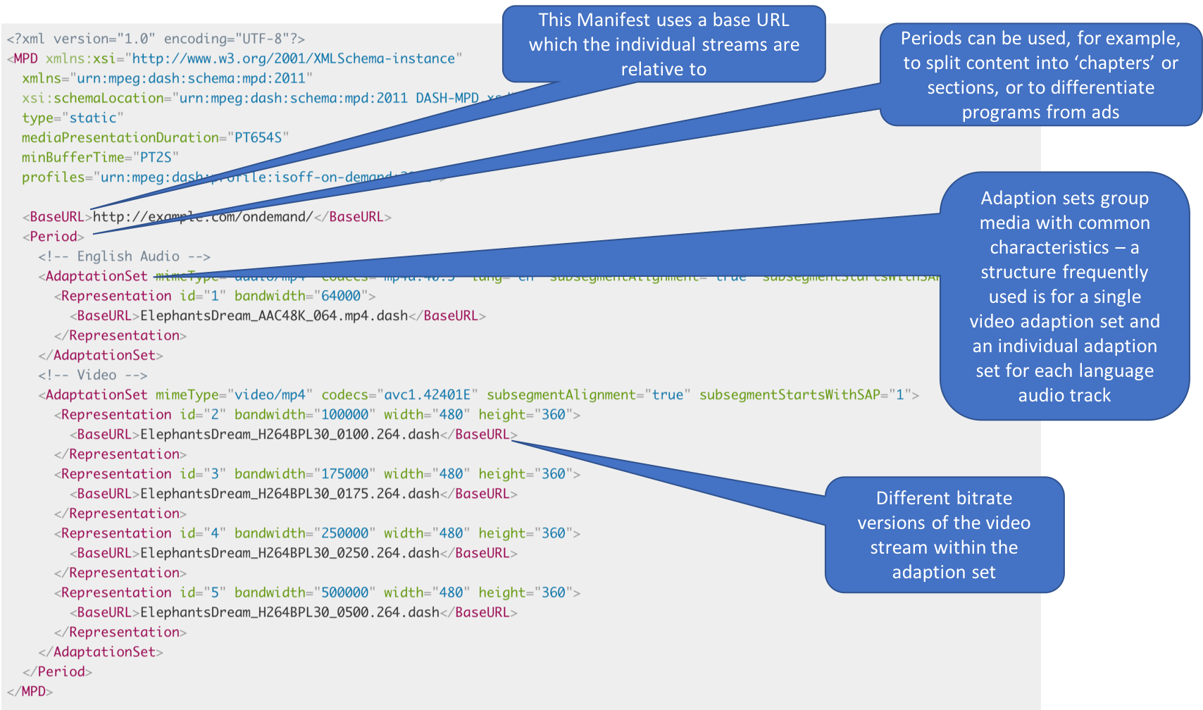在编写本报告时,有许多示例DASH清单文件可用,其中包括Mozilla站点中的这个: