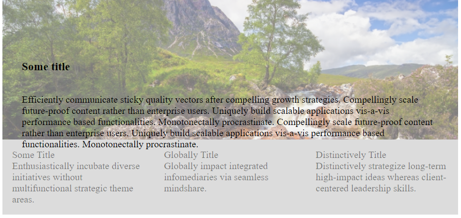 我玩过你的密码。为了总是有一些填充,无论多宽,你将不得不使用相对定位的文本和绝对定位的图像。由于-是填充-底部将因其有多宽而有所不同,我建议您将图像作为一个background-image cover ,并将背景图像的大小设置为css中的cover,这样就不会有任何间隙,不管屏幕有多宽/窄/高/短。我尝试了80%宽度的给定代码,并将填充设置为33% (我没有将背景图像代码放进去)为50%,您的初始宽度不需要底部填充。