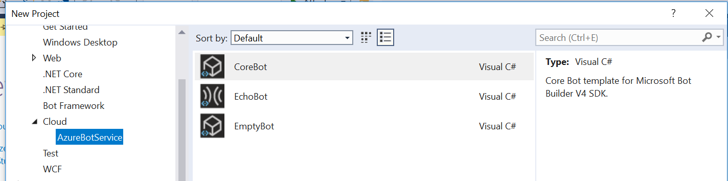 我是ChatBot开发新手,在我检查过的所有教程中,我使用模板ChatBot应用程序开始了一个示例,我没有在我的VisualStudio2017社区版中看到这一点,我只看到以下模板,如果我使用这些模板中的任何一个,我没有看到任何对IDialog接口的引用。任何线索都是很棒的help.Thanks