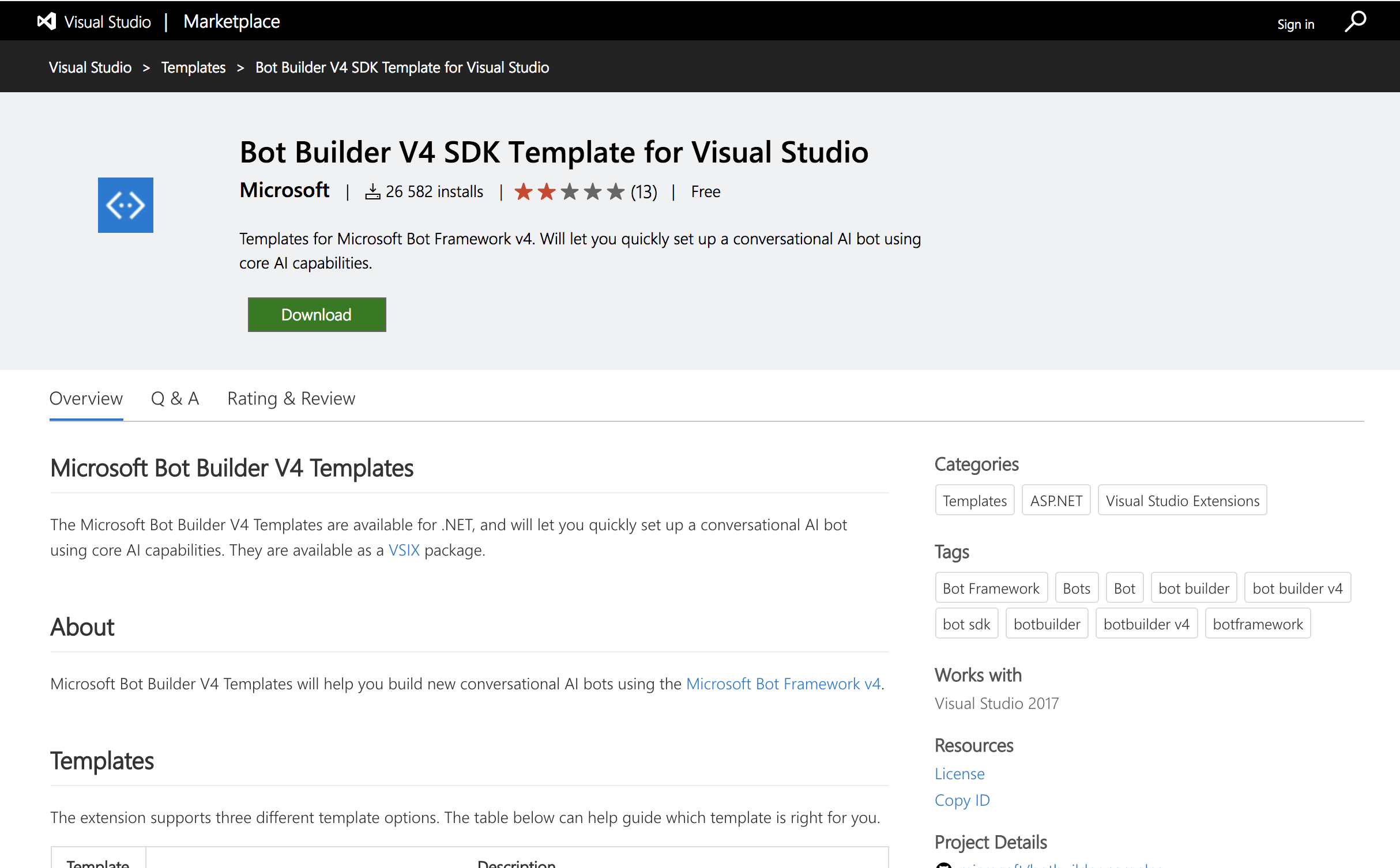 用于Visual的Bot框架v4模板可通过Visual Studio Marketplace获得,此处为:https://marketplace.visualstudio.com/items?itemName=BotBuilder.botbuilderv4