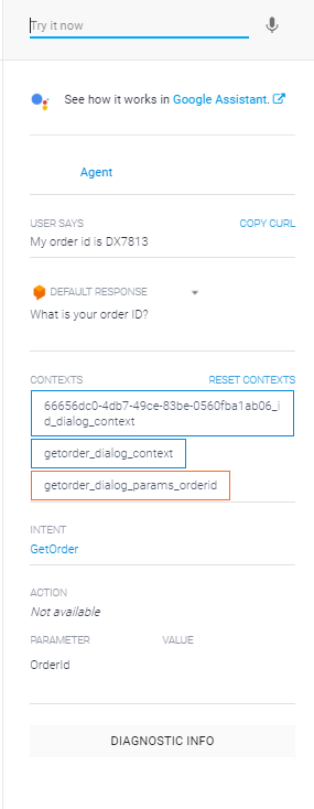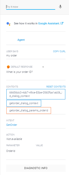 现在,除非我给出了来自列车短语的确切订单ID,或者我在实体中定义的ID示例,否则它总是给我一个空参数OrderID的响应,我的意图是说“我的订单”,然后提示我“您的ID是什么?”