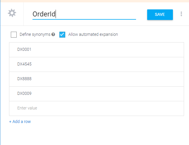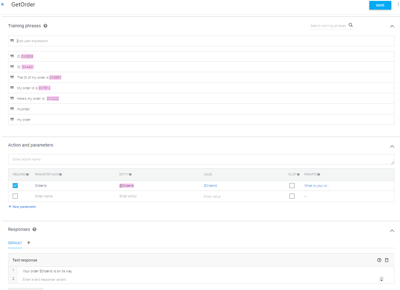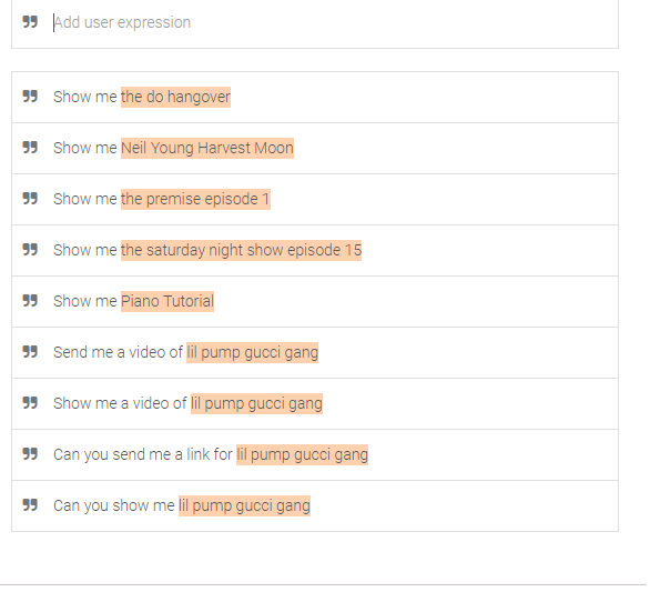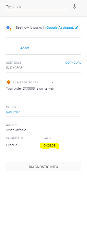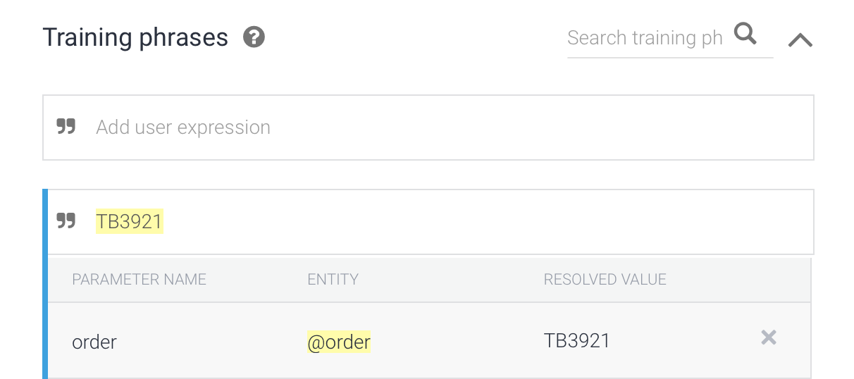 在培训短语或实体中,如果不添加从DX0001到DX9999的所有可能的订单id,我如何才能使其工作。我的意思是,它确实适用于我的youtube查询,我可以把任何东西放在那里--它可以“捕获”这个值。有什么帮助吗?