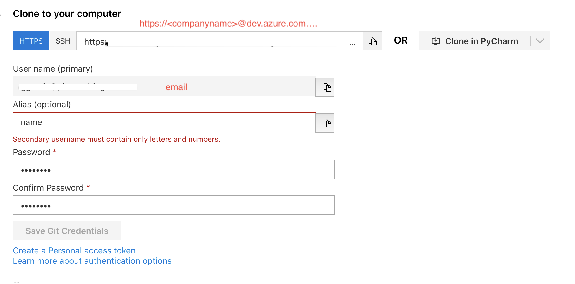 git clone https://<your credentials name>@dev.azure.com/<companyname>/<project name/_git/<repository name>