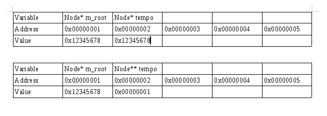 在这张图片里你可以看到。如果使用Node* tempo = m_root,则tempo将包含m_root中值的副本。如果您更改了tempo,那么m_root将保持不变。