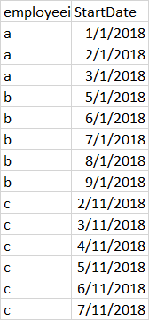 a<- data.frame(employeeid =c('a','b','c'), StartDate= c('2018-1-1','2018-1-5','2018-11-2'),