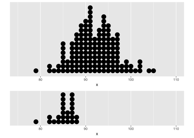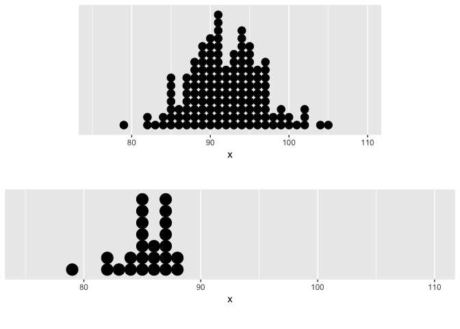 ggsave("dotplot.png", width = 12, height = 5.9)简单随机注释:使用geom_point()解决方案,保存绘图需要调整大小,以确保点的大小(点大小和图的高度/宽度)。使用geom_dotplot()解决方案,我对标签进行了舍入,使其更加美观。不幸的是,我无法在大约100的时候切断轴:使用limits()或coord_cartesian()会导致重新缩放整个地块,而不是裁剪。还请注意,为了使用geom_dotplot(),我创建了一个基于计数的数据向量,因为我无法直接使用count变量(我希望stat="identity"能够这样做,但我无法使它工作)。