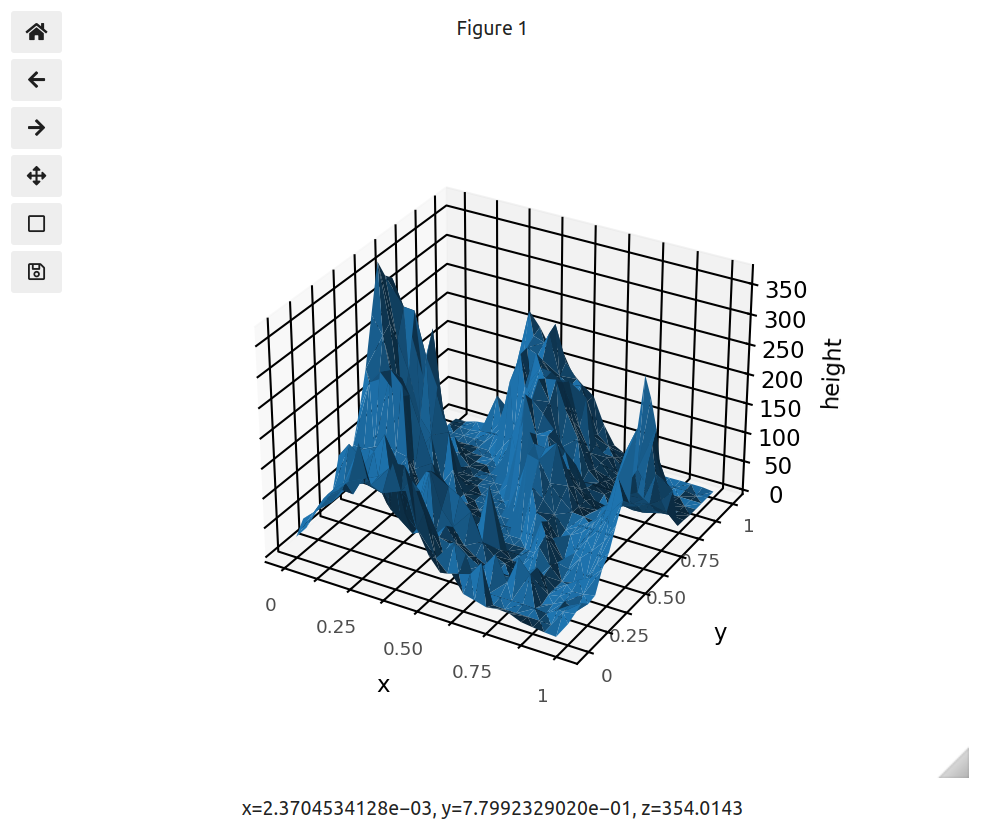 mt_bruno_long = pd.DataFrame({'x': x.flatten(), 'y': y.flatten(), 'height': z.flatten()})然后,我们需要创建ggplot和geom_polygon的等价物,并了解第三维空间。