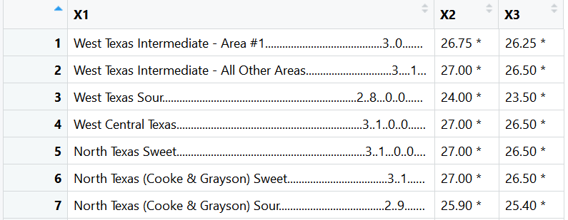 [4,] " West Texas Intermediate - Area #1..............................\t30.75 *\r\a"
