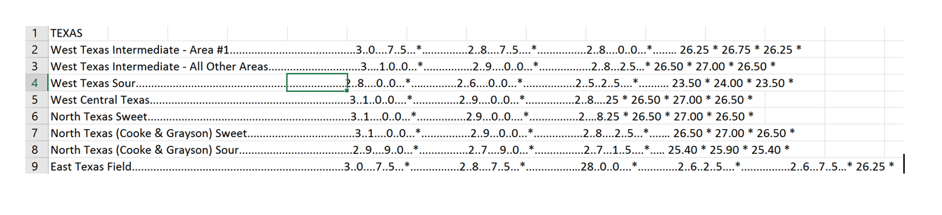 [16,] " Texas Central Gulf Coast (Giddings).............................\t30.00 *\r\a"