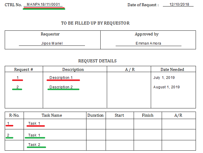 | Ctrl_No | Request_No | Tasks |
