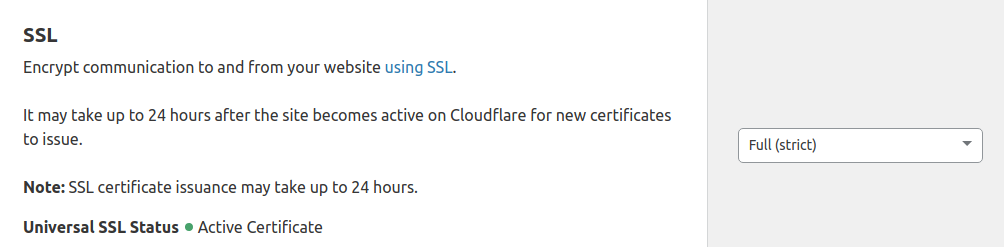 在cloudflares加密设置中,我将SSL设置为Full (Strict),Universal SSL Status位于Active Certificate上,如您所见: