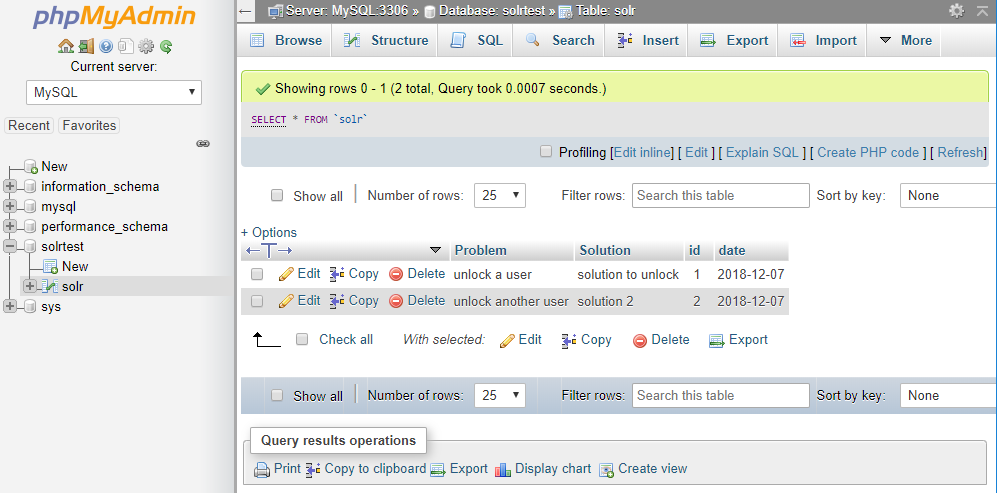 如您所见,我有一个名为solrtest的db,其中表solr具有字段id、日期、问题和解决方案。
