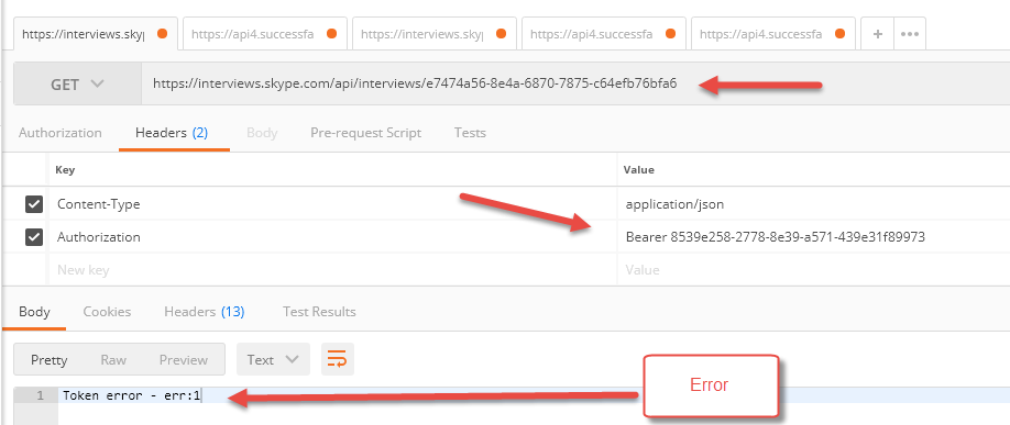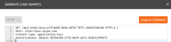 如果您的应用程序想要利用Skype面试后提供的所有信息,比如面试官的笔记、反馈和候选人的书面代码快照,那么您可以通过一个简单的HTTP请求来请求数据。 要检索诸如“备注”、“反馈”和“代码快照”等信息,只需向CODE发出HTTP请求即可。 注意:对于GET请求,请省略JWT令牌中的子属性。 这里有一个检索信息的示例请求。 请求 取得/api/访问/您的_访谈_代码HTTP/1.1 主机: interviews.skype.com 授权:无记名内容-类型:应用程序/json