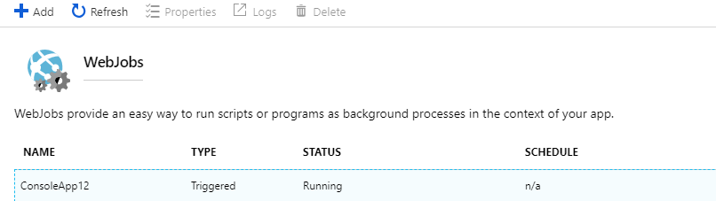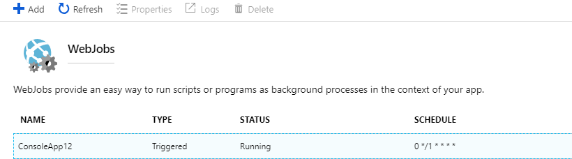 但是,在使用上述方法通过Visual 2017进行部署时,您只能在WebJob的生存期内运行它一次。因此,您也只能在日志列表中获得一个父日志。