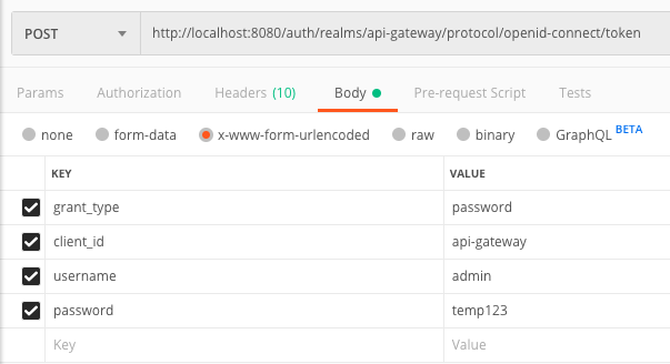 -d 'grant_type=password&client_id=api-gateway&username=admin&password=temp123'邮递员(为参数选择x-www-form-urlencoded选项)