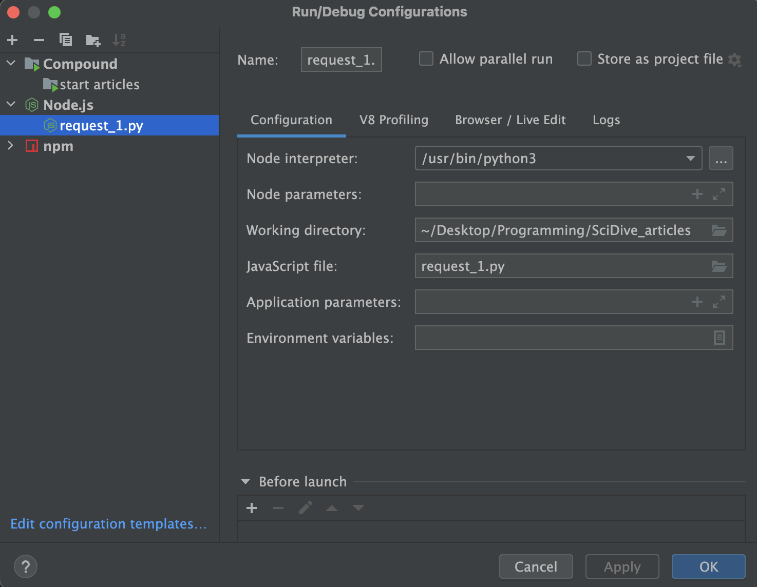 我找到了一种在webstorm中运行python脚本的方法。我需要它来运行项目的后端部分。我将节点配置添加到运行配置,并将解释器编辑到python路径。