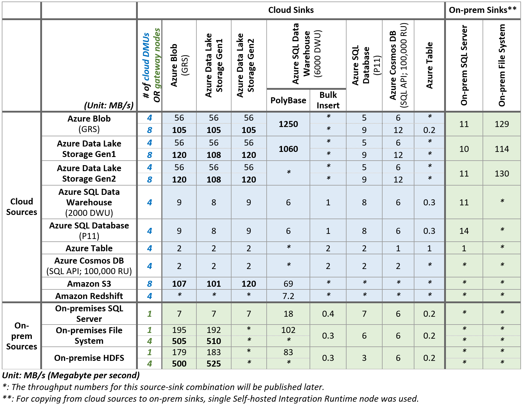 该表显示了基于内部测试运行的单个副本活动中给定源和接收器对的MBps副本吞吐量数字。