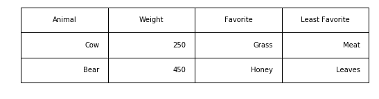 ax.table(cellText=np.vstack([df.columns, df.values]), cellColours=[['lightgray']*c] + [['none']*c]*2, bbox=[0,0,1,1])输出: