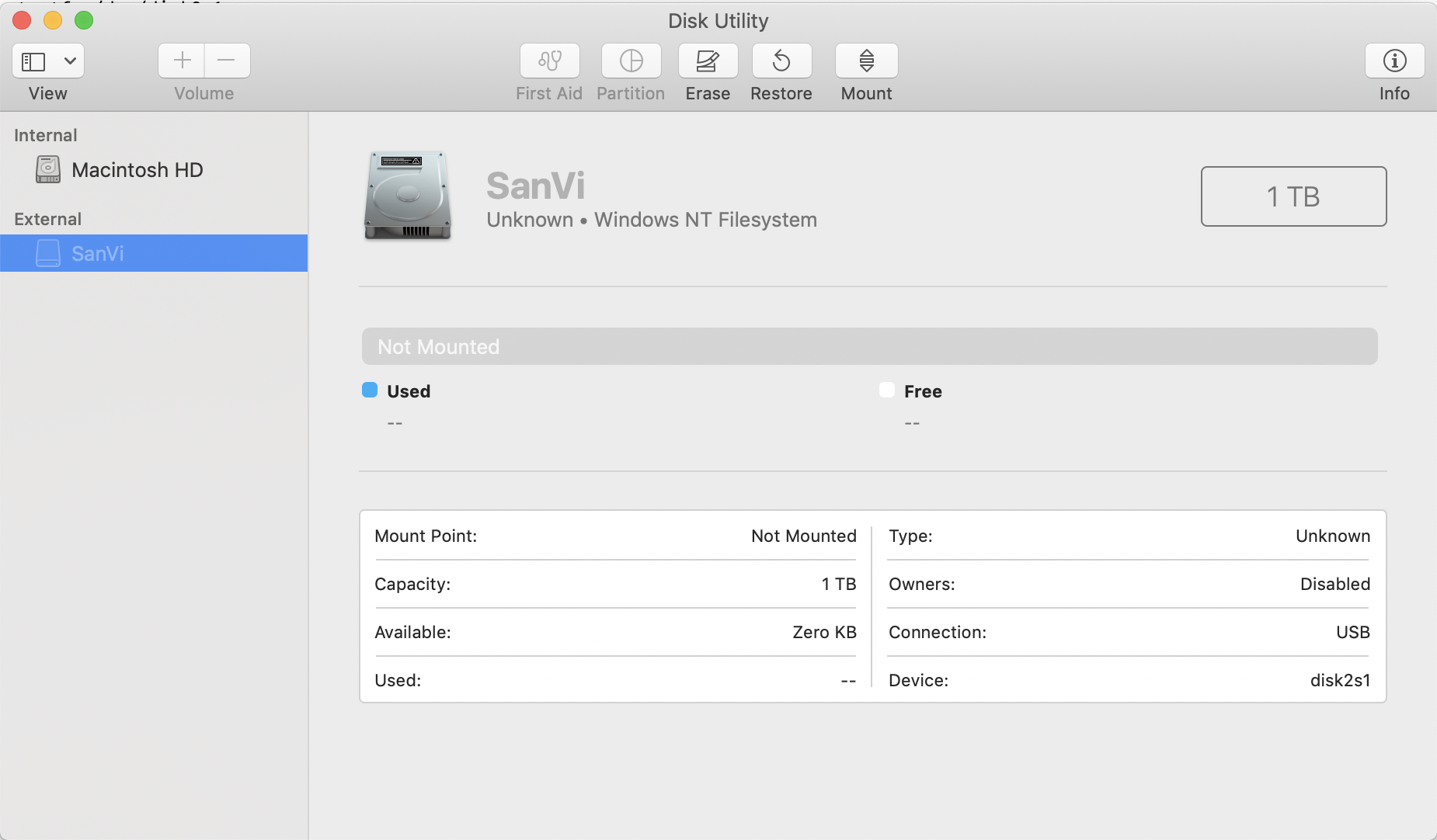 正如您在图像中看到的,硬盘根本没有被挂载。我也没有得到急救的选择。但是,它在Windows和Linux中运行得很好。