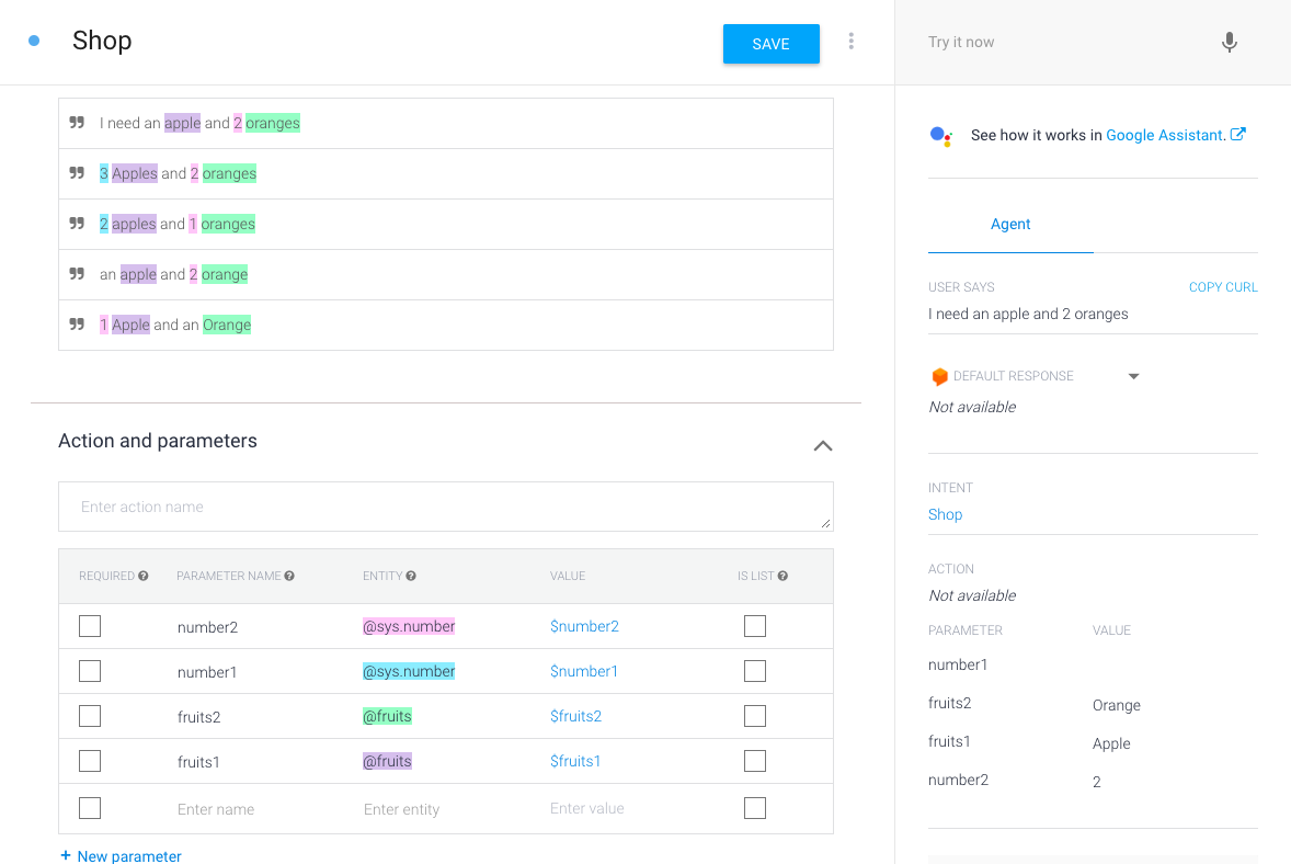 假设我有一个实体fruits来标识水果,并且我正在使用@sys.number来识别水果的数量。