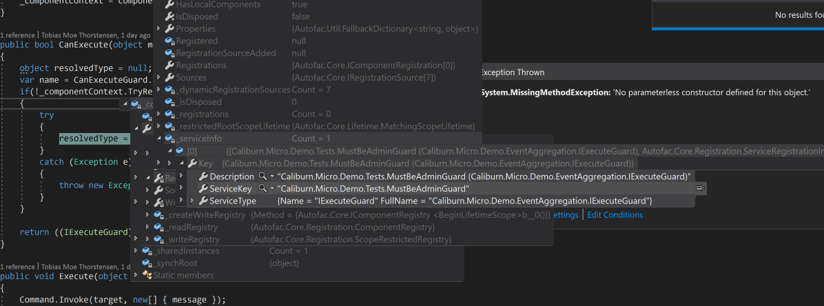 lifeTimeScope.IsRegisteredWithName("Caliburn.Micro.Demo.Tests.MustBeAdminGuard",typeof(MustBeAdminGuard))这个查询返回true。传递IComponentContext而不是ILifeTimeScope的真正区别是什么?我认为这个接口只公开了ILifeTimeScope公开的方法的一个子集。