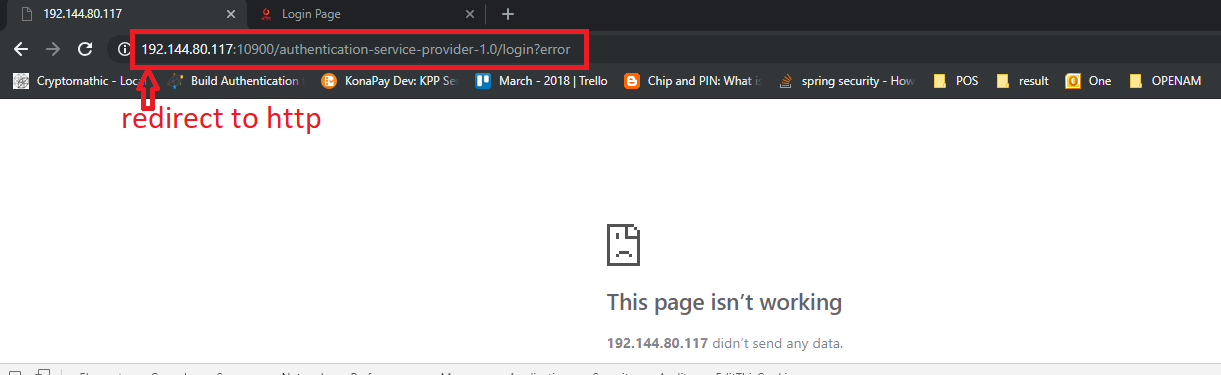 提供登录信息(用于测试目的的错误凭据)并单击submit。它应该返回:https://192.144.80.117:10900/authentication-service-provider-1.0/login?error