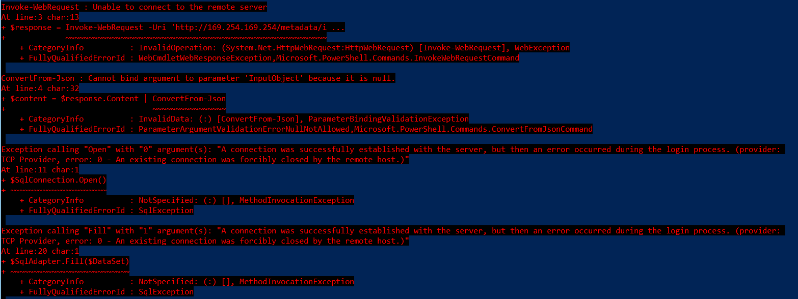 $response = Invoke-WebRequest -Uri 'http://169.254.169.254/metadata/identity/oauth2/token?api-version=2018-02-01&resource=https%3A%2F%2Fdatabase.windows.net%2F' -Method GET -Headers @{Metadata="true"}
