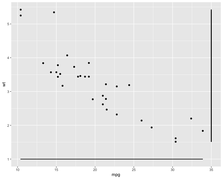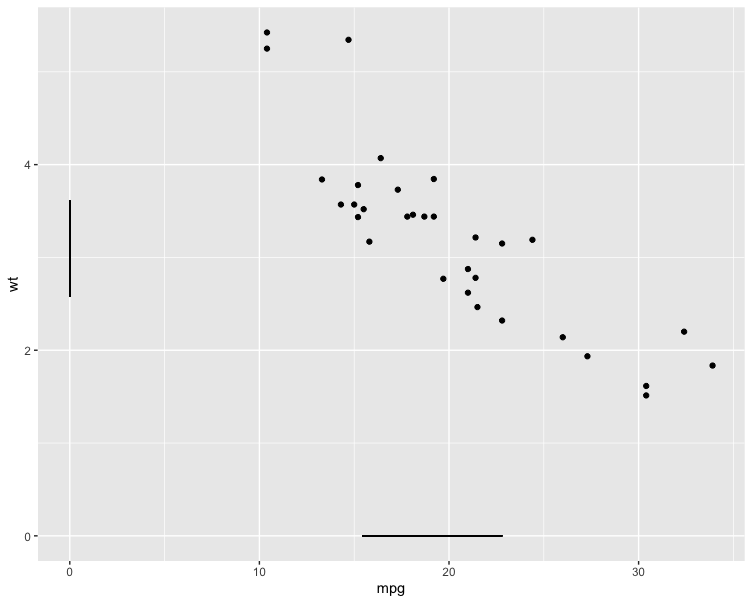 geom将读取数据,而对于所提供的变量,("x", "y")将绘制(因为缺少更好的单词) shadows:默认y=0处的水平线min(x)--max(x)和默认x=0处的垂直线min(y)--max(y)。如果提供了选项,这些“锚”可以更改,例如,如果用户提供x = 35, y = 1,则在拦截y = 1处绘制水平线,而在拦截x = 35处绘制垂直线。用法: