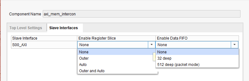 启用数据FIFO的目的是提供数据缓冲并支持更高的吞吐量。32深模式选项提供了基于32深度LUT的FIFO (仅数据信道),而512 deep (分组模式)提供了基于512个深块RAM的分组FIFO。分组FIFO模式在相关地址信道上提供了一个额外的32深度FIFO,以避免在突发过程中出现满/空的中断。这基本上增加了读/写操作的延迟,以避免中断。要获得更多的深度信息,请阅读以下页面。(AXI互连v2.1-PG.94)。这些备选方案规定如下: