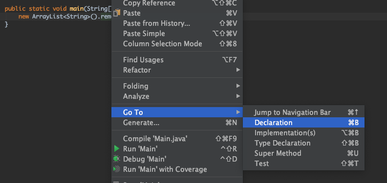 您可以在macOS上使用"Command + click“,或者在Windows或Linux上使用"Ctrl + click”,而游标在方法上以查看它的实现。如果插入符号位于方法名称内,也可以键入“命令/ctrl+ B”,而不是单击。如果它不明确,IntelliJ将允许您从列表中进行选择。