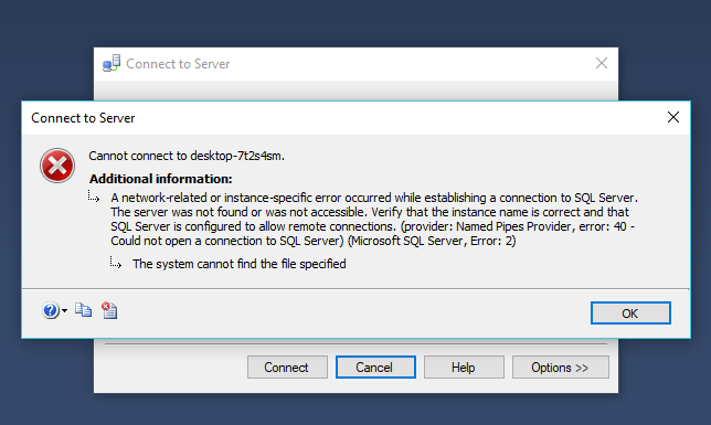与服务器实例的连接可能会出现问题。我将尝试从这个帖子How do I fix the error 'Named Pipes Provider, error 40 - Could not open a connection to' SQL Server'?或这个视频https://www.youtube.com/watch?v=810cv3PunkA中的问题和答案中的故障排除步骤。
