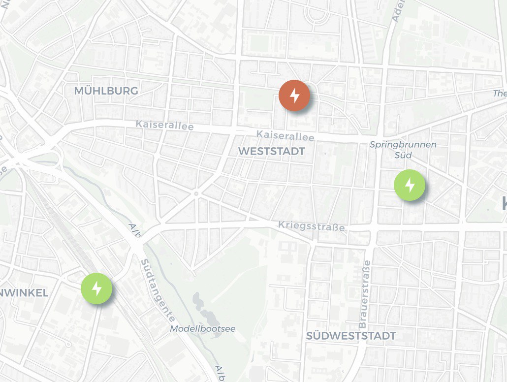 我有一张显示电动汽车充电站的地图。充电站可以是目前可用的,然后他们将显示一个绿色标记在地图上。否则,它们将不可用,并将以地图上的红色标记表示。