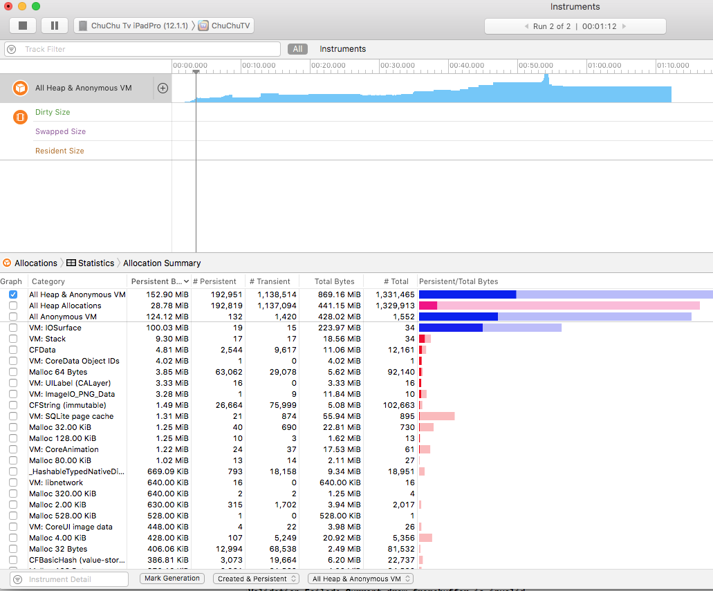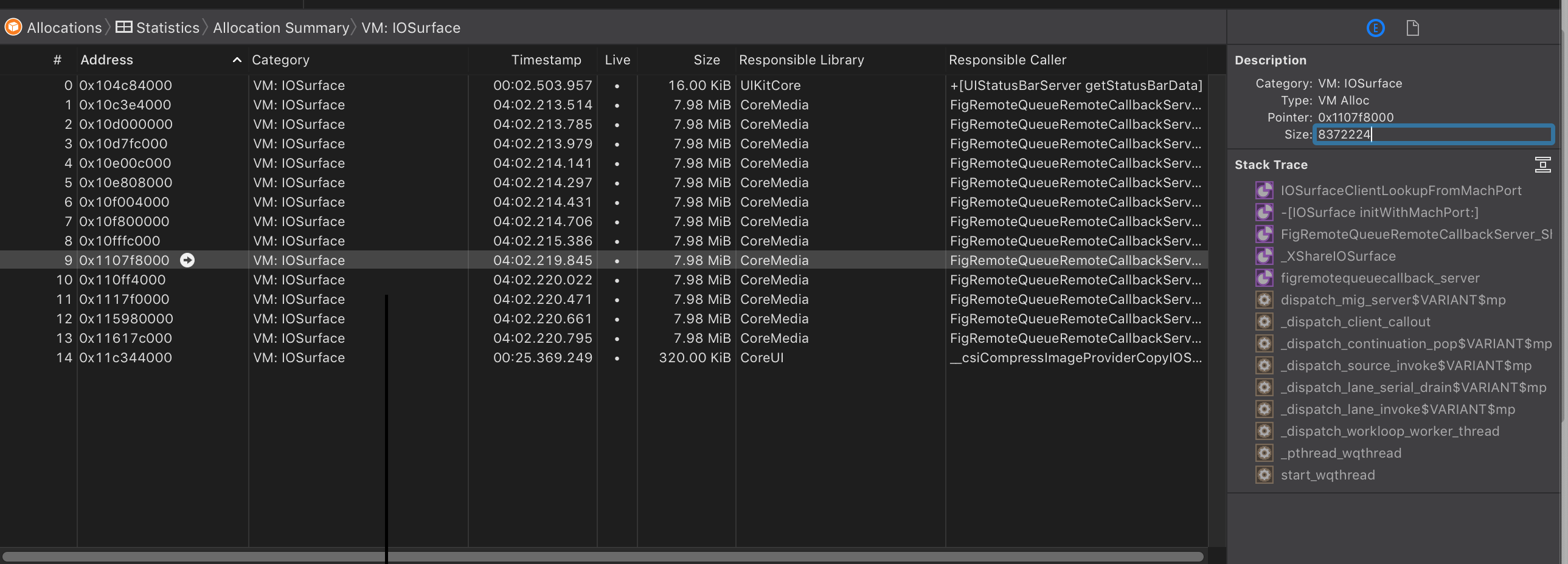 我在iOS 12及以上版本的应用程序中面临内存问题。IOSurface在iOS 12.1.1中逐渐增加,因为它在iOS 11版本中运行良好。我附上了下面的问题截图,