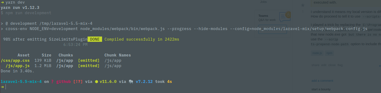 如果没有看到您的webpack.mix.js文件,就很难说出问题的所在。我克隆了Laravel5.5分支,并将其升级为^4.0.13 of laravel-mix,并成功地运行了yarn dev和yarn prod,尽管我使用的是npm和node的最新版本。