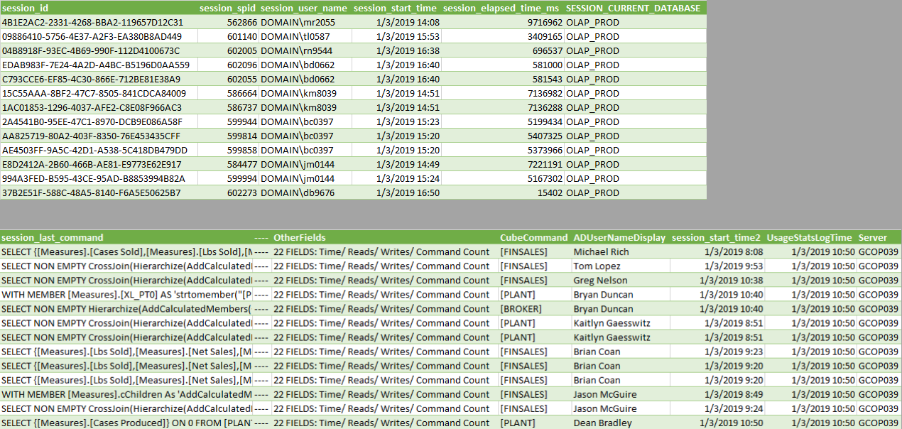 [DISCOVER_SESSIONS]以 server -A为数据源。在“服务器-B”上,SSIS包[SSISDB/IsolatedPackages/SSASUsageStats.dtsx]写入自定义DB表[DBA].[dbo].[UsageStatsLogOLAP]。 使用Excel提取和转换源,并将其加载到Excel中,然后从Excel传输到Server表。SSIS执行Excel刷新和数据传输到Server。完成SSIS包后,Excel数据集将加载到Server中,以添加新记录。下面演示了Excel示例数据集。(注意: Excel由于其提取“CubeCommand”字段子字符串分析和从“SESSION_USER_NAME”中提取“ADUserNameDisplay”字段Active查找的简单性而被选择为数据提取ETL工具)。这使得分析用户OLAP会话超时成为可能。SSIS包将作为SQL代理作业每15分钟运行一次,以向自定义Server表添加新会话。