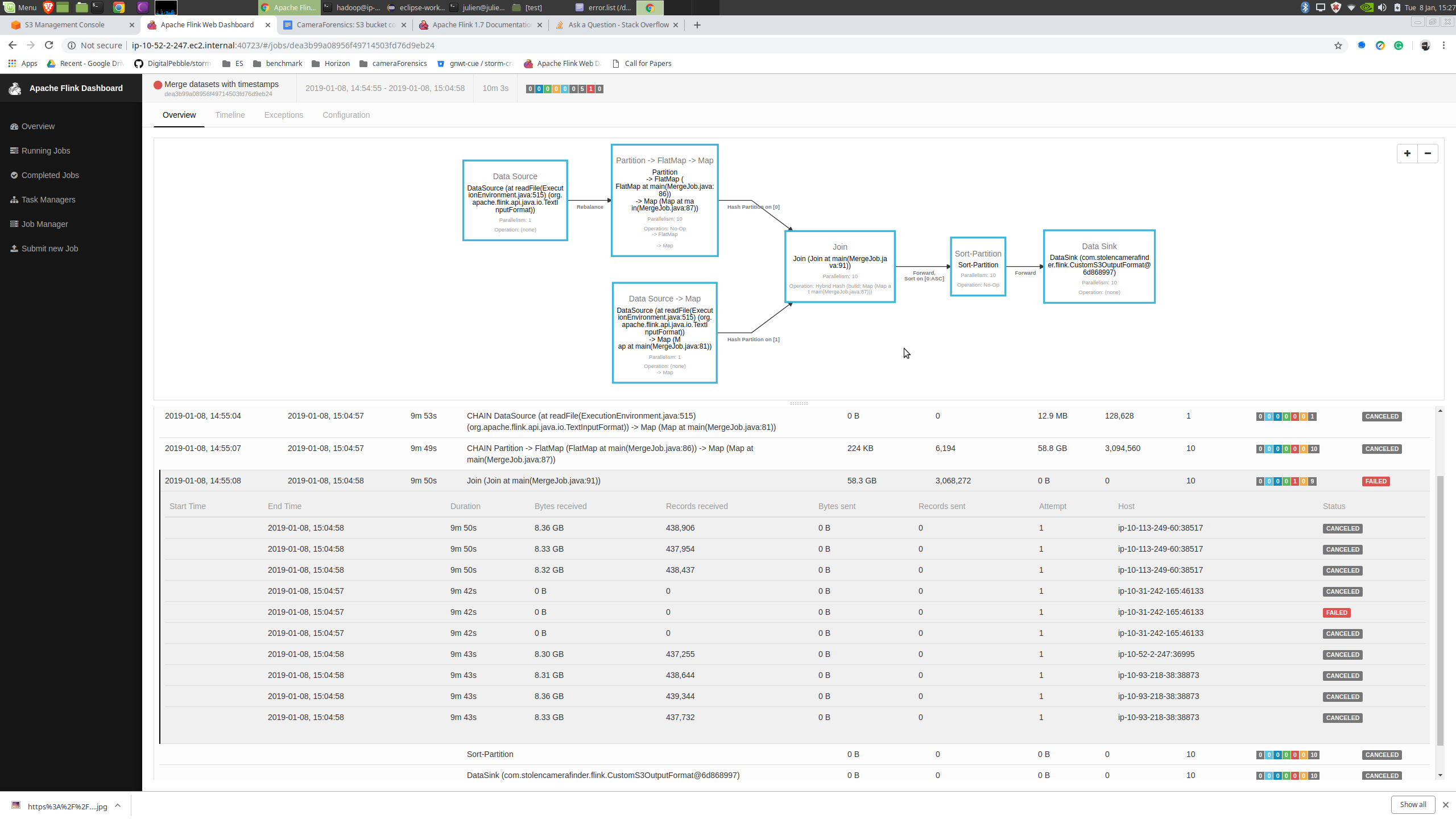 这是我在概述中看到的。失败发生在一个没有得到任何输入的任务管理器上。奇怪的是,前一组(分区->平面映射->映射)没有向任务管理器发送任何东西,尽管前面有一个重新平衡。