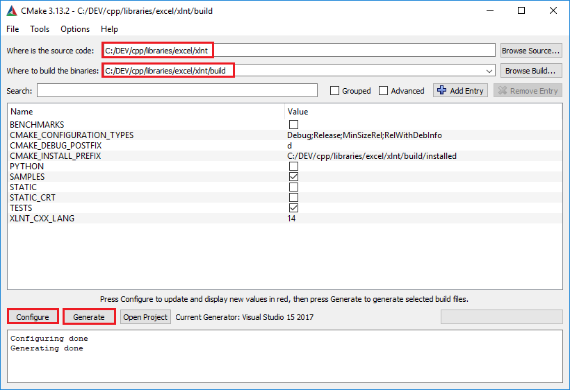 buildxlnt/buildConfigure按钮选择要使用的工具(IDE/编译器)Generate按钮,CMake将生成编译xlnt库所需的visual studio 2017项目文件(在构建文件夹中)xlnt.lib、xlnt.exp和xlnt.dll文件。
