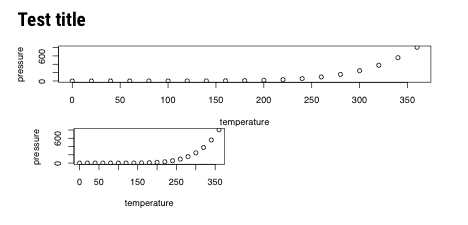 您可以使用out.width块选项来完成它。这需要一个字符值,它将作为宽度插入到LaTeX中,而不仅仅是像fig.width这样的数字。例如,将第二个块更改为