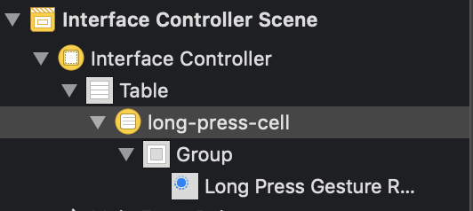 万一有用的话..。我也一直在努力:在屏幕截图中“Table”下附加“长新闻手势识别器”,而不是“Group”,并链接到WKInterfaceController中的一个动作: