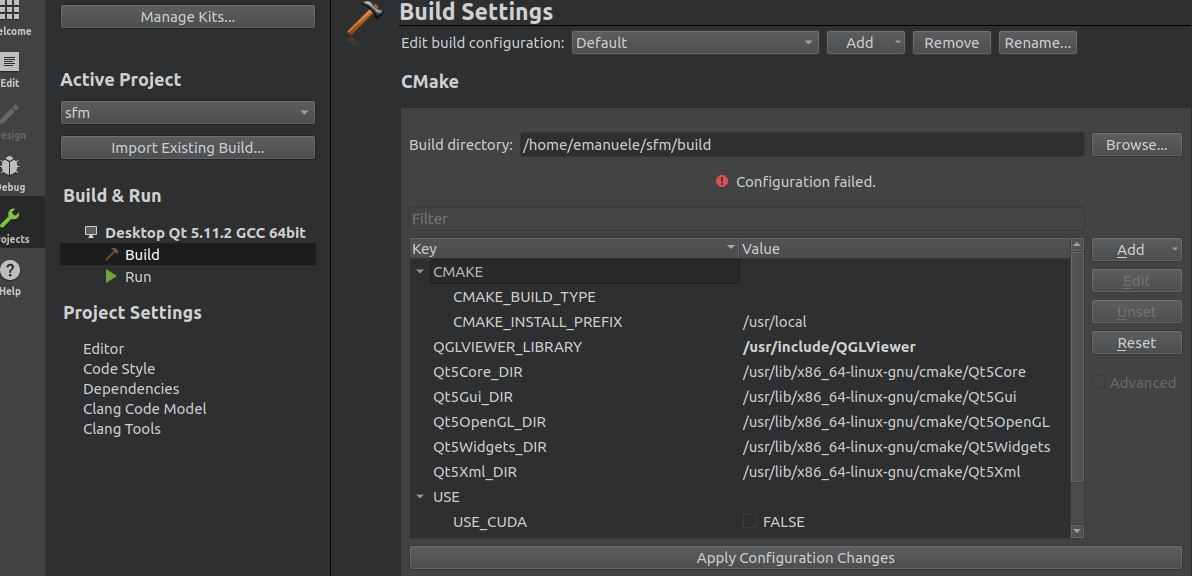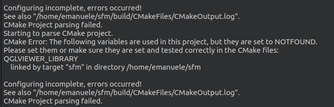 CMake错误:在此项目中使用了以下变量,但它们被设置为NOTFOUND。请设置它们或确保它们在CMake文件中被正确设置和测试:目录/home/emanuele/sfm中由目标"sfm“链接的QGLVIEWER_LIBRARY