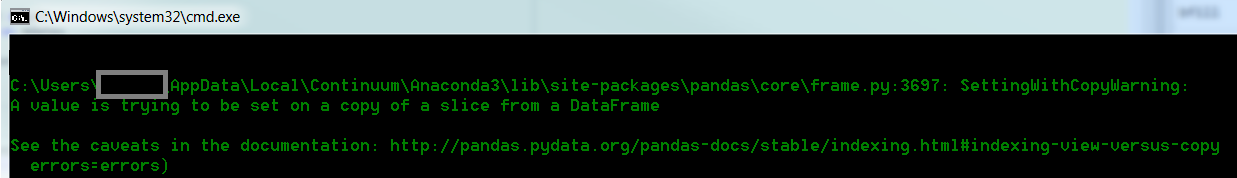 我正在使用熊猫运行一些数据清理例程,这些程序是使用批处理文件以最简单的方式执行的。我的Python中的一行将触发SettingWithCopyWarning并打印到控制台。但它也在命令提示符中得到响应: