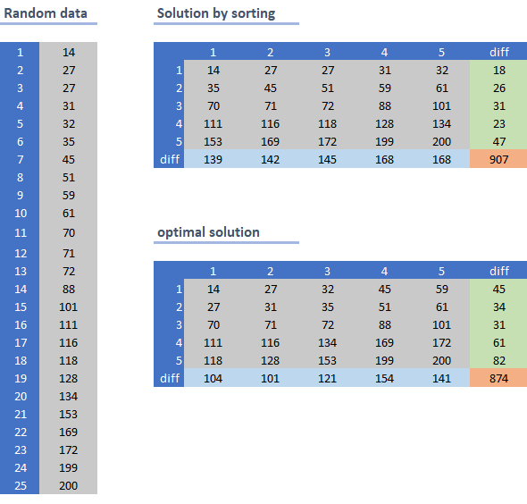第二种解决方案是用混合整数编程模型实现的。它被证明是最优的(但我添加了一个约束,即值在行和列上都在增加)。