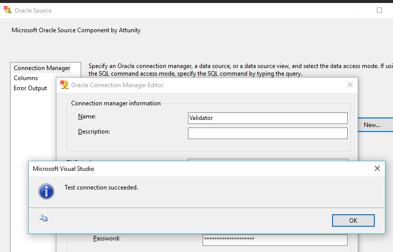 post Attunity更新后无法工作中记录了一个问题,它指出了Oracle连接器的5.0版与最新版本的SSDT之间的兼容性问题(截至02/01/2019年为15.9.x)。在兼容性问题得到解决之前,事实上的解决方案是部署SSDT的15.8.0版本。这将安装14.0.3002.113 Microsoft集成服务设计器。