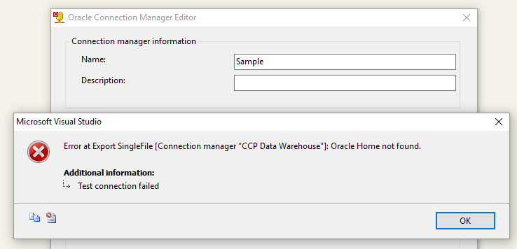 Error at Export SingleFile [Connection manager "Sample"]: Oracle Home not found.