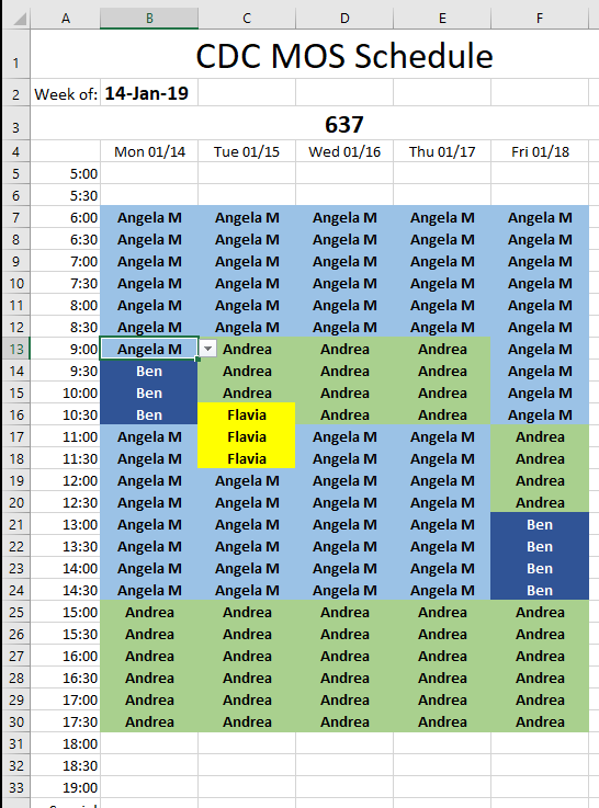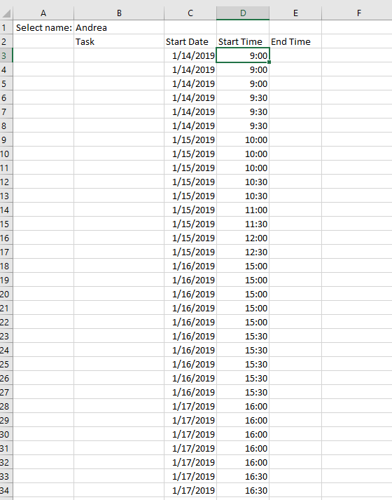 我希望在C3中看到的是"1/14/19",在D3 "15:00“中,然后在C4”1/14/19“和D4 "15:30”中。。。等