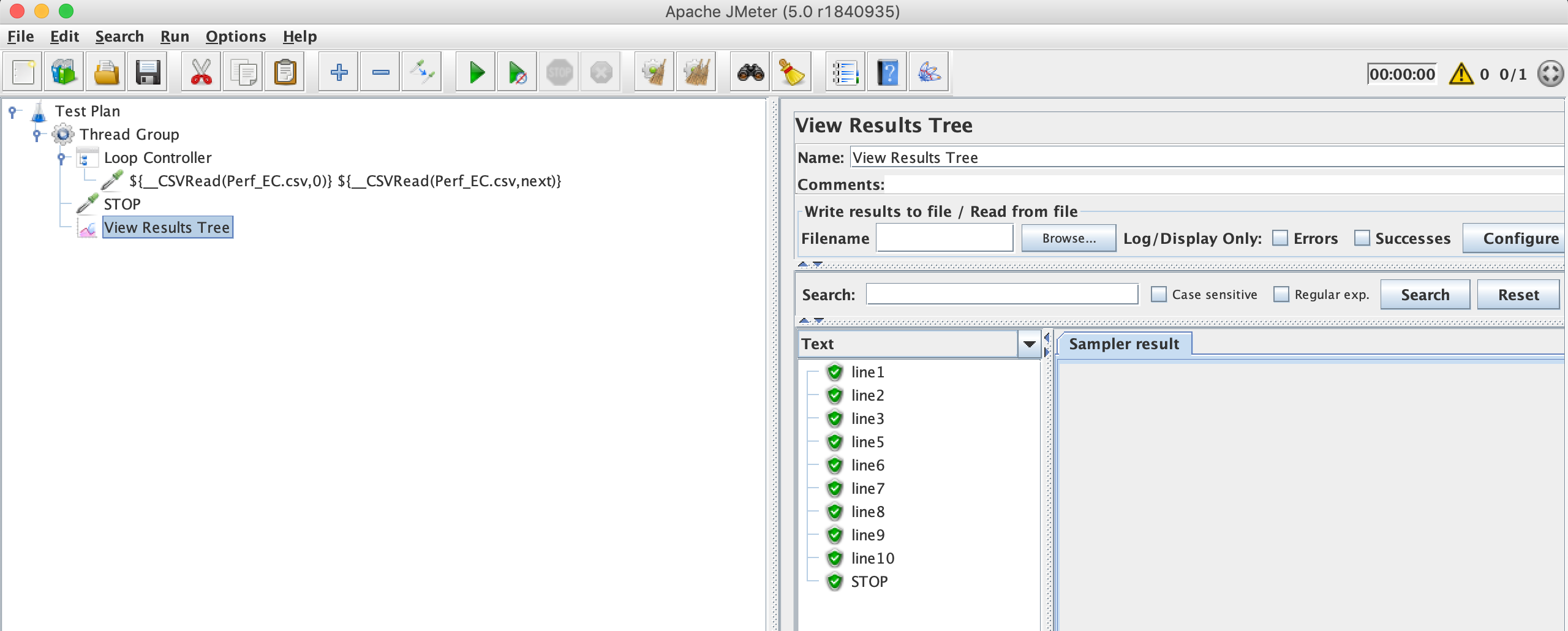 我有一个csv文件,它只有一列和多行。我希望所有的线程通过所有的行文件和每个线程读取一行,从开始到结束,停止线程时,一个文件的结束。如何使用Jmeter中的CSVRead()函数来实现这一点。